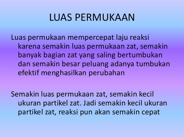 Jadi semakin kecil ukuran partikel zat maka reaksipun akan berlangsung cepat. Konsep teori ini adalah bahwa reaksi antara zat terjadi karena terjadinya tumbukan tabrakan partikel reaktannya. Apakah yang menyebabkan faktor faktor tersebut dapat mempengaruh laju reaksi.