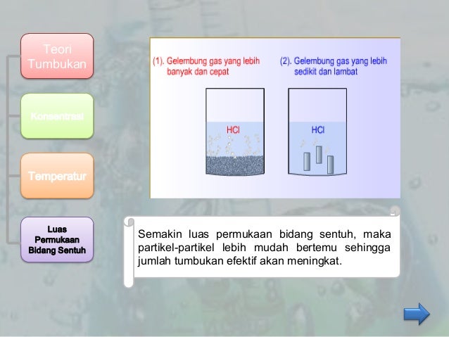 Teori tumbukan luas permukaan. Pada luas permukaan sentuh yang besar tumbukan antar partikel lebih banyak sehingga laju reaksinya juga cepat. Luas permukaan bidang sentuh. Bila luas permukaan terus menjadi besar mungkin terjalin singgungan antarpereaksi pula hendak terus menjadi besar.